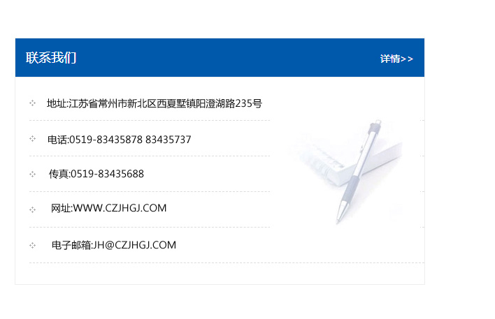 地址:常州市新北區友邦商務大廈1幢16、17層  電話:0519-85101652  傳真:0519-85112595  郵編:213022  網址:www.cz-jiayue_cn.zydlfj.com  郵箱:xiajifengaa@163.com
